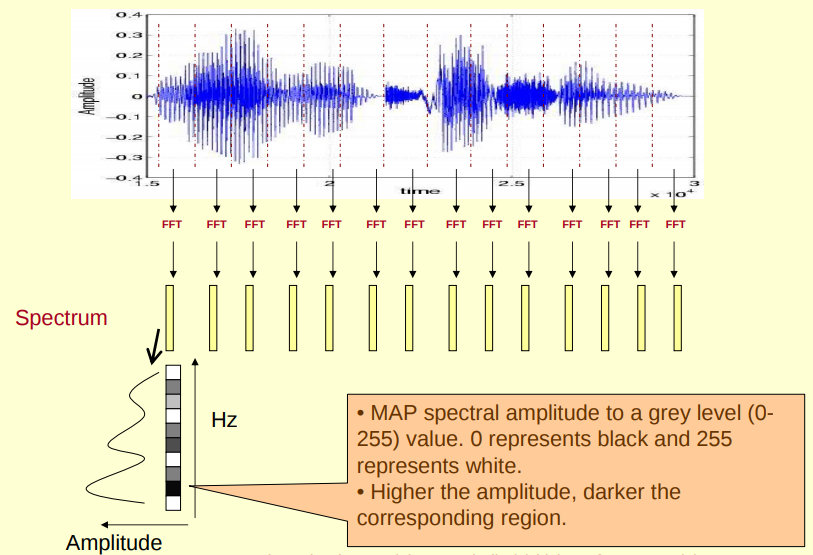 (1)对原始信号进行分帧加窗后,可以得到很多帧,对每一帧做 FFT(快速傅里叶变换),傅里叶变换的作用是把时域信号转为频域信号,把每一帧 FFT 后的频域信号(频谱图)在时间上堆叠起来就可以得到声谱图,其直观理解可以形象地表示为以下几个图,图源见CMU 语音课程 slides。