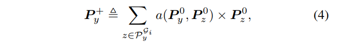 对于${\cal G}_i$上类别$y$的父类$z$,通过衡量$y$与$z$相似性的边权重$a(P_y^0,P_z^0)$传播$P_z^0$到类$y$。通过如下式子聚合所有来自父类的信息(从上到下一层一层的聚集)