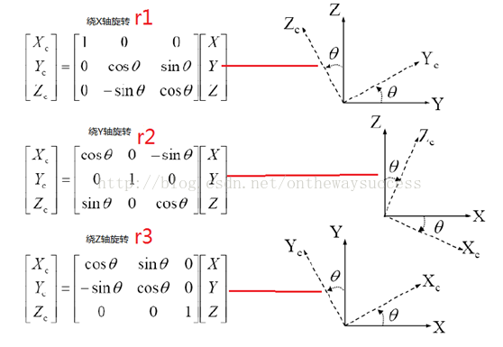 从世界坐标系到相机坐标系的变换属于刚性变换,也就是平移和旋转组成。因此在世界坐标系中点$Pw$在摄像机坐标系中坐标为$Pc$,他们之间的关系式为:$Pc=R*Pw+T$.其中$T=(Tx,Ty,Tz)$是一个平移向量,这里是将世界坐标系原点坐标平移到摄像机坐标系原点坐标,$R=R(α,β,γ)$是一个旋转矩阵,这个旋转矩阵由三个旋转角度确定,分别是绕摄像机坐标系$z$轴旋转角度$γ$,绕$y$轴旋转角度$β$,绕$x$轴旋转角度$α$: