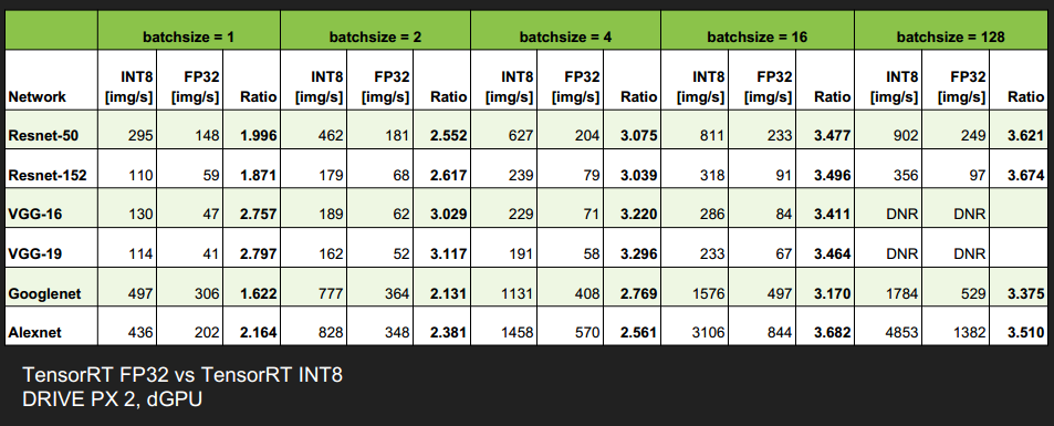 TensorRT 的INT8模式只支持计算能力为6.1的GPU(Compute Capability 6.1 ),比如: GP102 (Tesla P40 and NVIDIA Titan X), GP104 (Tesla P4), and GP106 GPUs,主要根源是这些GPU支持 DP4A硬件指令。DP4A下面会稍微介绍一下。