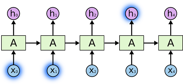 有时候,我们仅仅需要知道先前的信息来执行当前的任务。例如,我们有一个语言模型用来基于先前的词来预测下一个词。如果我们试着预测 “the clouds are in the sky” 最后的词,我们并不需要任何其他的上下文 —— 因此下一个词很显然就应该是 sky。在这样的场景中,相关的信息和预测的词位置之间的间隔是非常小的,RNN可以学会使用先前的信息。