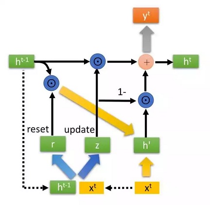 结合$x^t$和$h^{t-1}$,GRU会得到当前隐藏节点的输出$y^t$和传递给下一个节点的隐状态$h^t$。