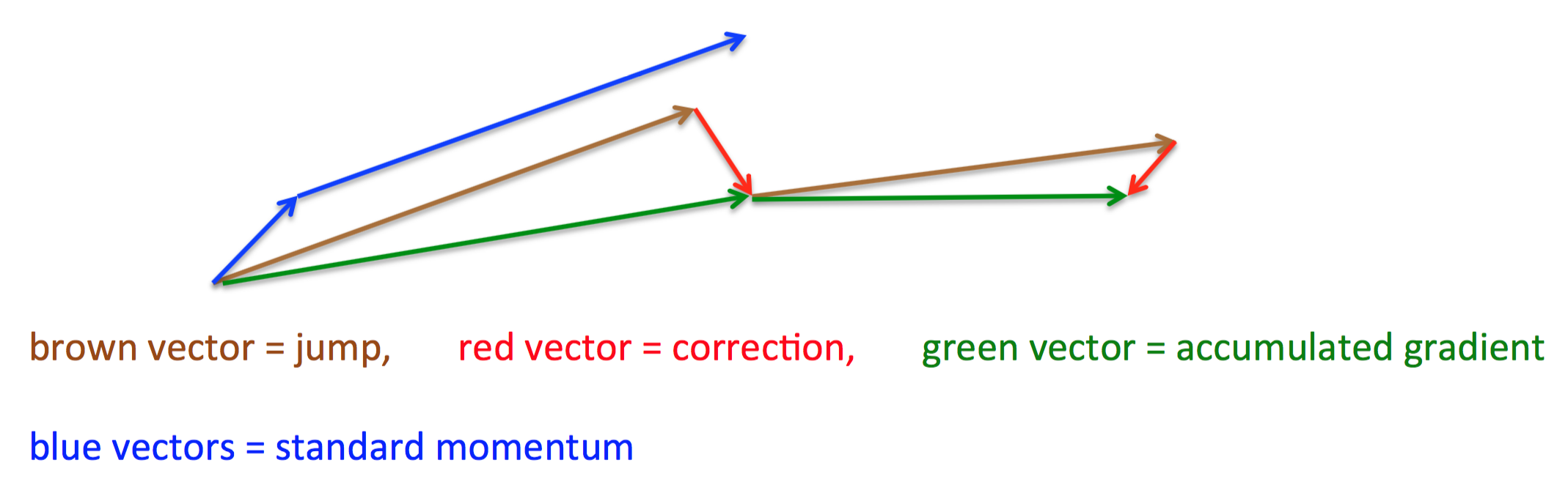 momentum算法首先计算一个梯度(短的蓝色向量),然后在加速更新梯度的方向进行一个大的跳跃(长的蓝色向量)。而nesterov项首先,按照原来的更新方向更新一步(棕色线),然后在该位置计算梯度值(红色线),然后用这个梯度值修正最终的更新方向(绿色线)。上图中描述了两步的更新示意图,其中蓝色线是标准momentum算法更新路径。这样可以阻止过快更新来提高响应性,如在RNNs中8