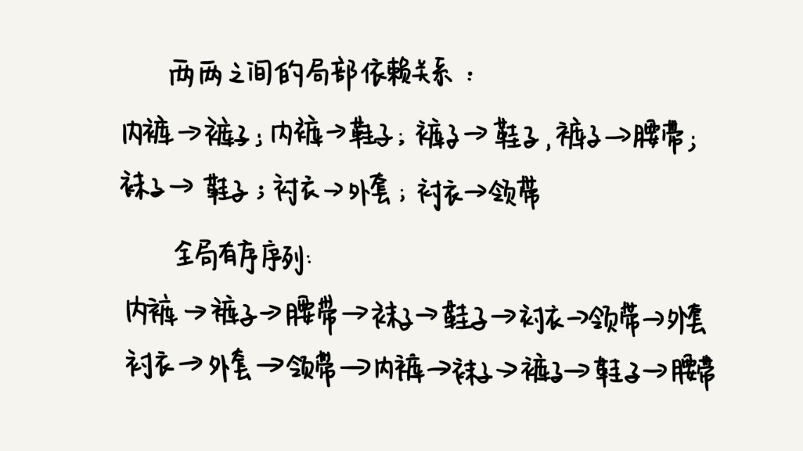 其实,生活中穿衣服时因为衣服与衣服之间有一定的依赖关系,所以穿衣都有一定的顺序。比如必须先穿袜子才能穿鞋,先穿内裤才能穿秋裤。假设我们现在有八件衣服要穿,它们之间的两两依赖关系我们已经很清楚了,那如何安排一个穿衣序列,能够满足所有的两两之间的依赖关系?这其实就是一个拓扑排序问题,从这个例子可以发现,拓扑排序的序列并不是唯一的。如下所示: