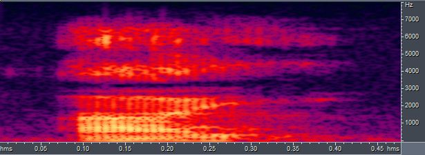 注意横轴是时间,纵轴是频率,颜色越亮代表强度越大。可以观察一下0.17s和0.4s处,是不是跟我上面画的频谱相似?然后再试着从这张语谱图上读出元音/æ/的第二共振峰频率。