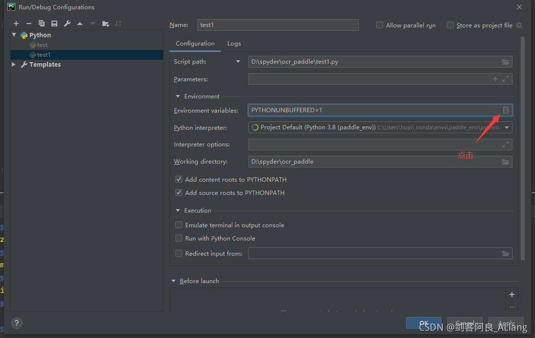 1、若在Pycharm下运行,此时需要在需要在Pycharm执行配置中添加一行配置:
